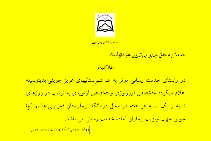 استقرار متخصصین ارولوژی وارتوپدی در درمانگاه بیمارستان قمر بنی هاشم (ع) جوین