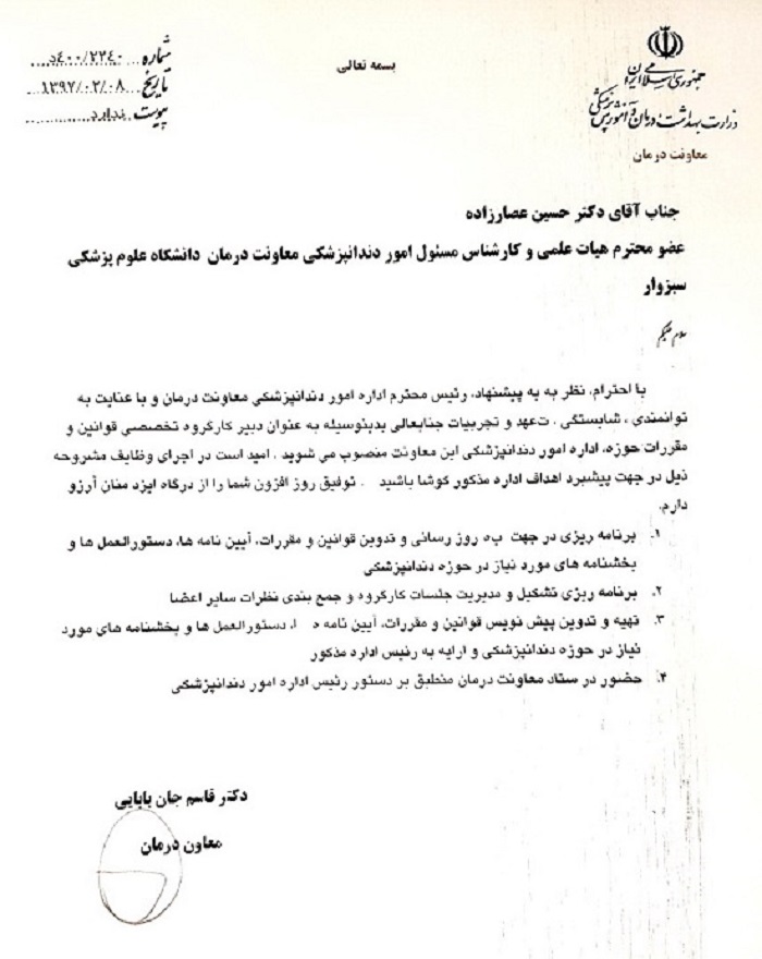 دبیر کارگروه تخصصی قوانین و مقررات حوزه،اداره امور دندانپزشکی معاونت درمان وزارت بهداشت منصوب شد.