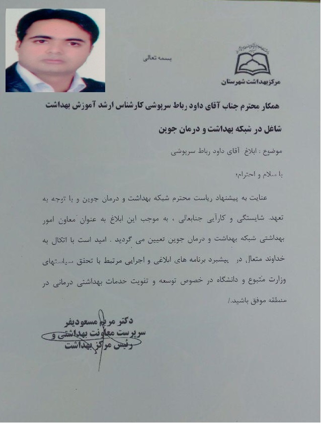 داود رباط سرپوشی به عنوان اولین معاون بهداشتی وریاست مرکز بهداشت شهرستان جوین منصوب شد.