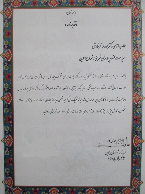 روابط عمومی شبکه بهداشت ودرمان جوین/مهندس جدي کار فرماندار شهرستان جوين  با توجه سرانجام رسیدن اجرای فاز اول طرح تحول سلامت حوزه شبکه بهداشت ودرمان جوین در مدت زمان کوتاه با اهداء لوح تقدیرنامه از دکتر قزلقارشی تجلیل بعمل آوردند متن تقدیر نامه به شرح ذیل می باشد: