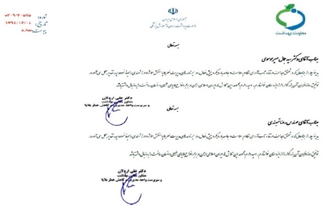 تقدیر از واحد مدیریت خطر بلایا معاونت بهداشتی دانشگاه علوم پزشکی سبزوار در سال 1394 توسط مشاور محترم معاونت بهداشت وزارت بهداشت ، درمان و آموزش پزشکی