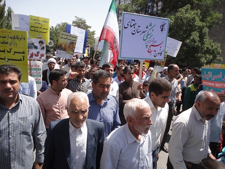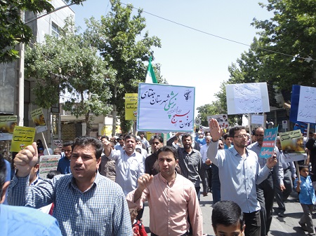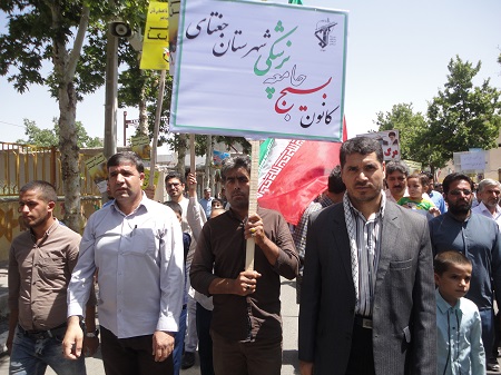 درآخرین جمعه ماه مبارک رمضان مورخه دوم تیرماه ، به مناسبت روز جهانی قدس و درحمایت ازمردم مظلوم فلسطین ، کارکنان شبکه بهداشت و درمان ، پرسنل بیمارستان ولی عصر(عج) و بسیجیان کانون بسیج جامعه پزشکی شهرستان جغتای به همراه دیگر اقشارمردم با شرکت در راهپیمایی روزقدس ومراسم باشکوه نمازجمعه ، ضمن تجدید میثاق باولایت و آرمانهای انقلاب اسلامی ، برائت خود را از اسرائیل غاصب ،آمریکا وکشورهای هم پیمان آنها اعلام  نمودند.