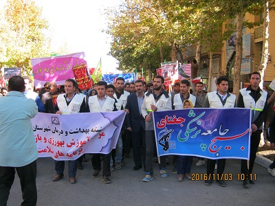 پرسنل شبکه بهداشت وبیمارستان ولی عصر(عج) ،دانش آموزان آموزشگاه بهورزری واعضای بسیج جامعه پزشکی شهرستان جغتای به منظور تجدید میثاق با آرمانهای بلند امام خمینی (ره) و رهبر معظم انقلاب همچنین در راستای حفظ و صیانت از آزادگی و استقلال ایران اسلامی، در راهپیمایی روز 13 آبان روزمبارزه با استکبارحضور یافته و با الهام از سرور و سالار شهیدان، آزادی و عزت طلبی را فریاد کشیدند. وبا سر دادن شعارهای مرگ برآمریکا و اسرائیل و ضد استکباری ، انزجار خود را از استکباران جهان در این مراسم اعلام نمودند .