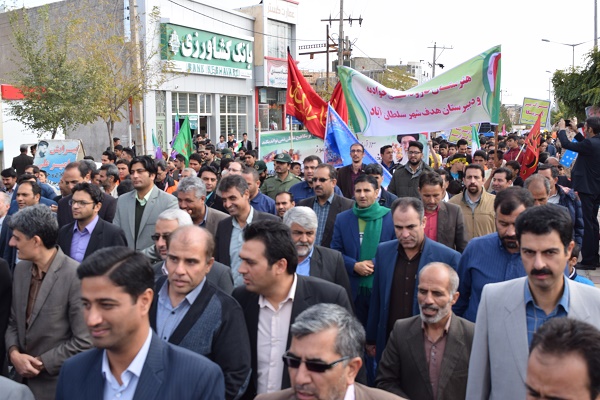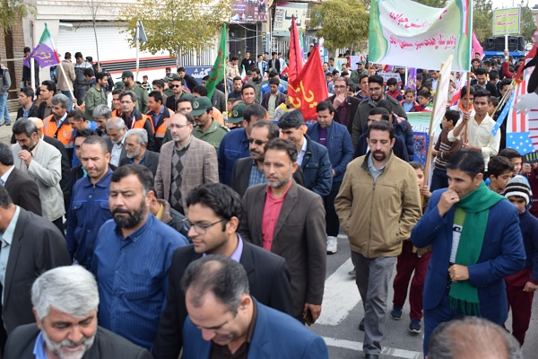 گفتنی است در این راهپیمایی که رئیس شبکه بهداشت ودرمان خوشاب به همراه پرسنل شبکه نیز هم پا و هم راستا  با اقشار مختلف مردم و گروه های دانش آموزی و دانشجویی در صفوفی متحد ومنسجم حضور داشتند ، با دردست داشتن پلاکارد و شعارهای استکبار ستیزی مرگ بر آمریکا، مرگ بر اسرائیل، هیهات من الذله و لبیک یا خامنه ای، انزجاز خود را از سیاست های استکباری آمریکا اعلام کردند.