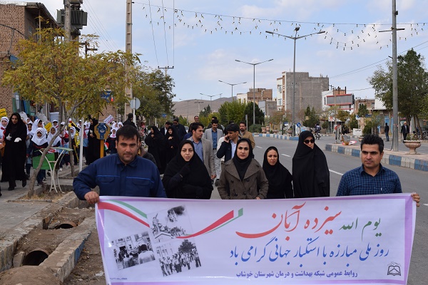 به گزارش روابط عمومی شبکه بهداشت ودرمان خوشاب : همزمان با راهپیمایی مردمی 13 آبان و روز دانش آموز، کارکنان این اداره با حضور در این مراسم، هم صدا با مردم با شعار مرگ بر استکبار و مرگ بر آمریکا، یوم الله 13 آبان را گرامی داشتند.
