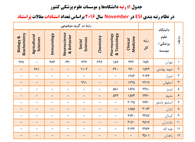 رتبه دانشگاههای علوم پزشکی کشور در نتایج ماه November سال 2016 میلادی نظام رتبهبندی ESI - Essential Science Indicators