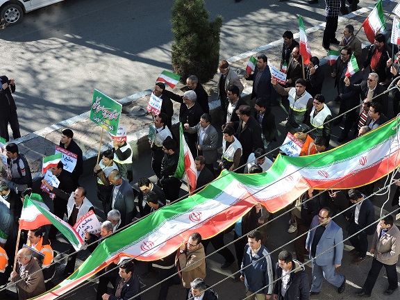 راهپیمایان در حالی که پرچم سه رنگ جمهوری اسلامی ایران را در دست داشتند، شعارهای مرگ بر آمریکا، مرگ بر اسرائیل، مرگ بر آل سعود، سر می دادند.