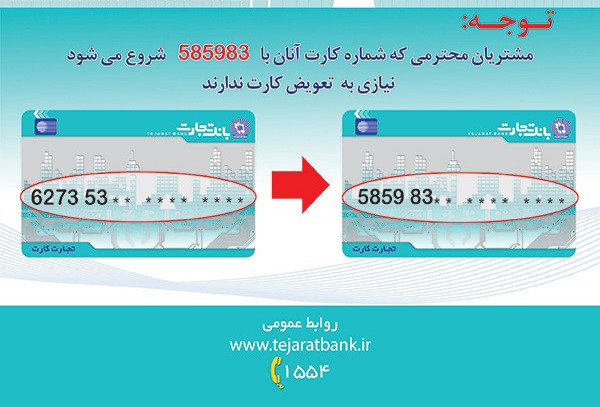 این بانک به منظور ارتقای سطح خدمات کارت، کارتهای مشتریان خود را تعویض میکند و بر همین اساس پیش شماره کارتهای بانک تجارت از 627353 به 585983 تغییر مییابد.