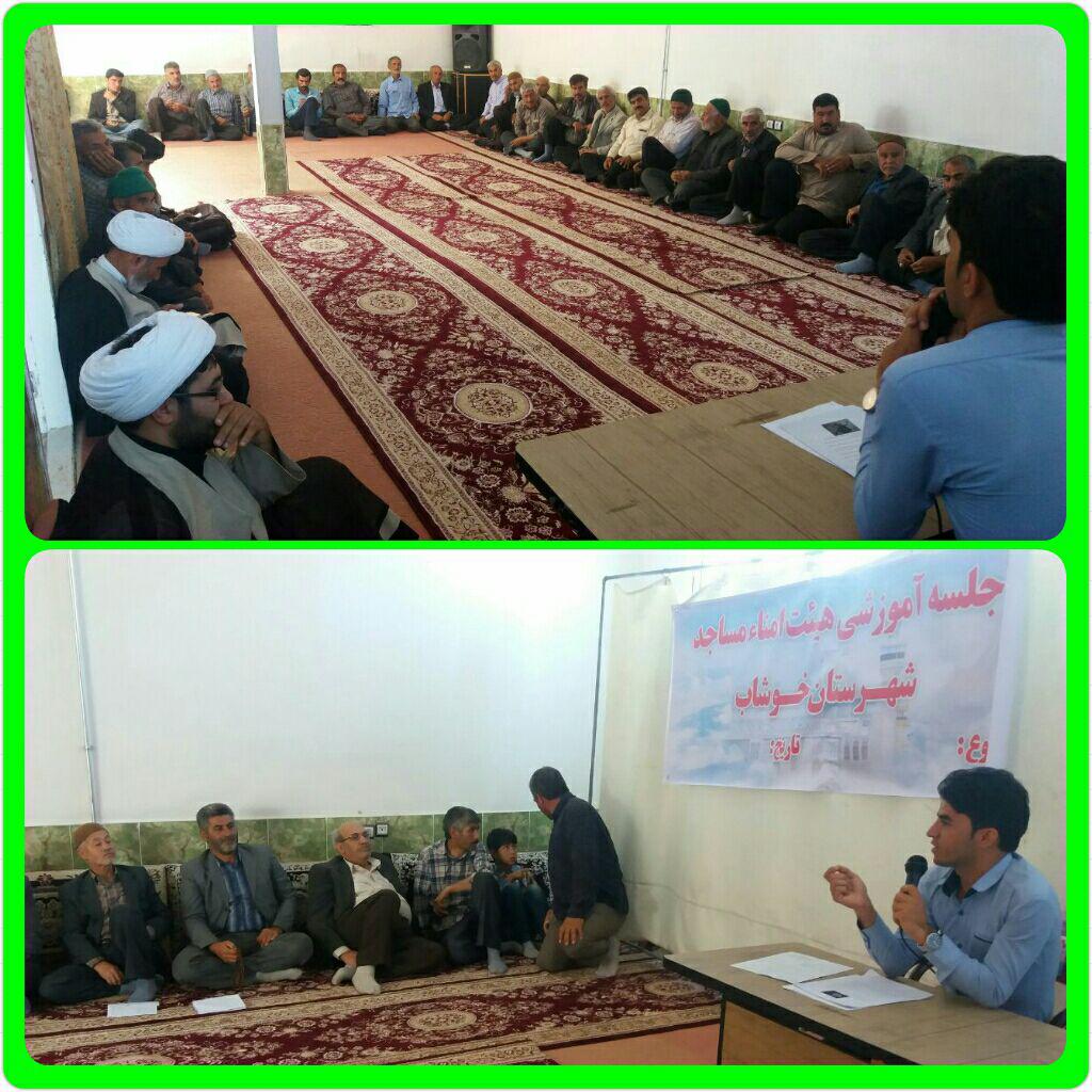 به مناسبت فرا رسیدن ایام محرم در مورخ 96/6/30 جلسه آموزشی با موضوع "بهداشت محیط مساجد و اماکن متبرکه و لزوم رعایت نکات بهداشتی بویژه در ماه محرم " با همکاری شبکه بهداشت و درمان خوشاب و امور مساجد شهرستان برای گروه هدف هیات امناء و خادمین مساجد سطح شهرستان در محل دفتر امام جمعه برگزار گردید.