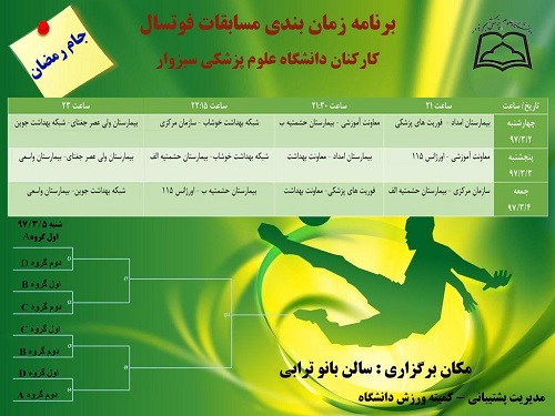 شبکه بهداشت 6به 1 در مقابل سازمان مرکزی ومعاونت آموزشی 5 به 3 در مقابل بیمارستان حشمتیه و بیمارستان ولی عصر جغتای 4 به 3 در مقابل شبکه بهداشت جوین به برتری رسیدند و بیمارستان شهید بهشتی امداد دربرابر فوریت های پزشکی1بر1 برابر شد.