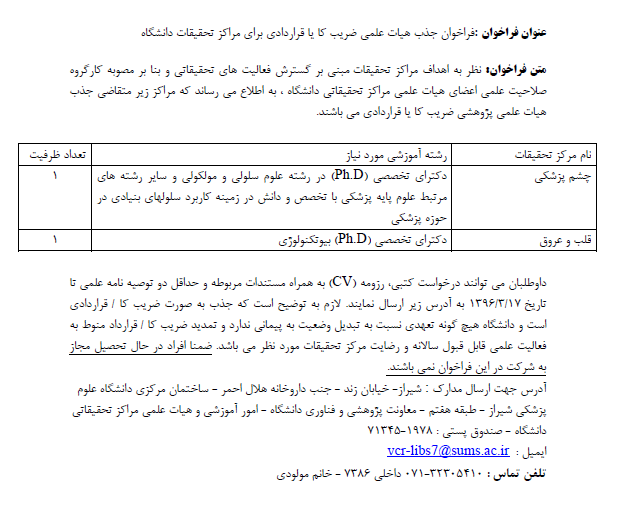 فراخوان جذب هیات علمی ضریب کا یا قراردادي براي مراکز تحقیقات دانشگاه