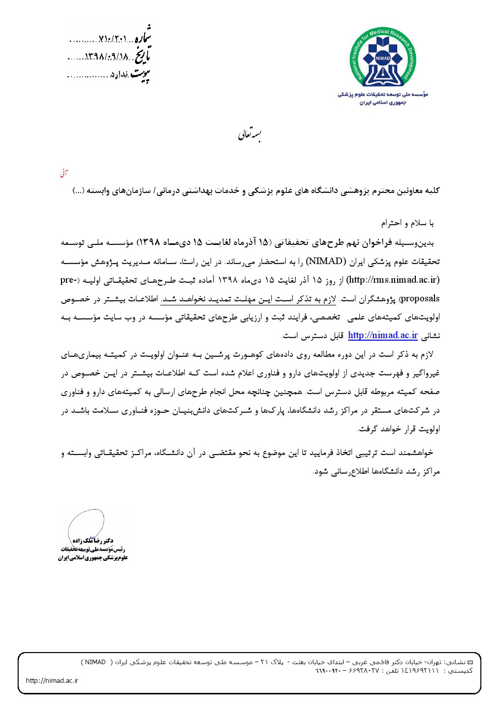 فراخوان نهم حمایت از طرحهای تحقیقاتی در موسسه نیماد