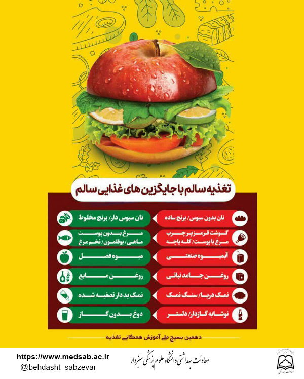 وی در ادامه گفت :  جایگزین های غذایی باید در دسترس  باشد تا توانایی استفاده برای هرکسی سهل و آسان باشد به طور مثال می توان نان سبوسدار جایگزین نان بدون سبوس وبرنج، گوشت مرغ و ماهی و تخم مرغ وحبوبات جایگزین گوشت قرمز پرچرب وکله پاچه، میوه های فصل جایگزین آبمیوه های صنعتی، روغن مایع جایگزین روغن جامد، نمک یددار تصفیه شده جایگزین نمک دریا وسنگ نمک ودوغ بدون گاز جایگزین نوشابه گازدار شود.