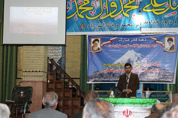 روابط عمومی شبکه بهداشت و درمان شهرستان جغتای/ به مناسبت ایام الله دهه فجر و چهلمین سالروز پیروزی انقلاب اسلامی و با برنامه ریزی ستاد دهه فجر در خصوص ارائه گزارش عملکرد دستگاههای اجرایی شهرستان در طول دهه فجر، دکتر علی شاهی ریاست بیمارستان در روز یک شنبه چهاردهم بهمن ماه با حضور در مسجد جامع شهر جغتای بعد از نماز مغرب وعشاء گزارشی از عملکرد شبکه بهداشت و بیمارستان  و پیشرفتهای این حوزه ها در طول چهار دهه انقلاب ارائه ودر پایان به سوالات حاضرین پاسخ دادند.