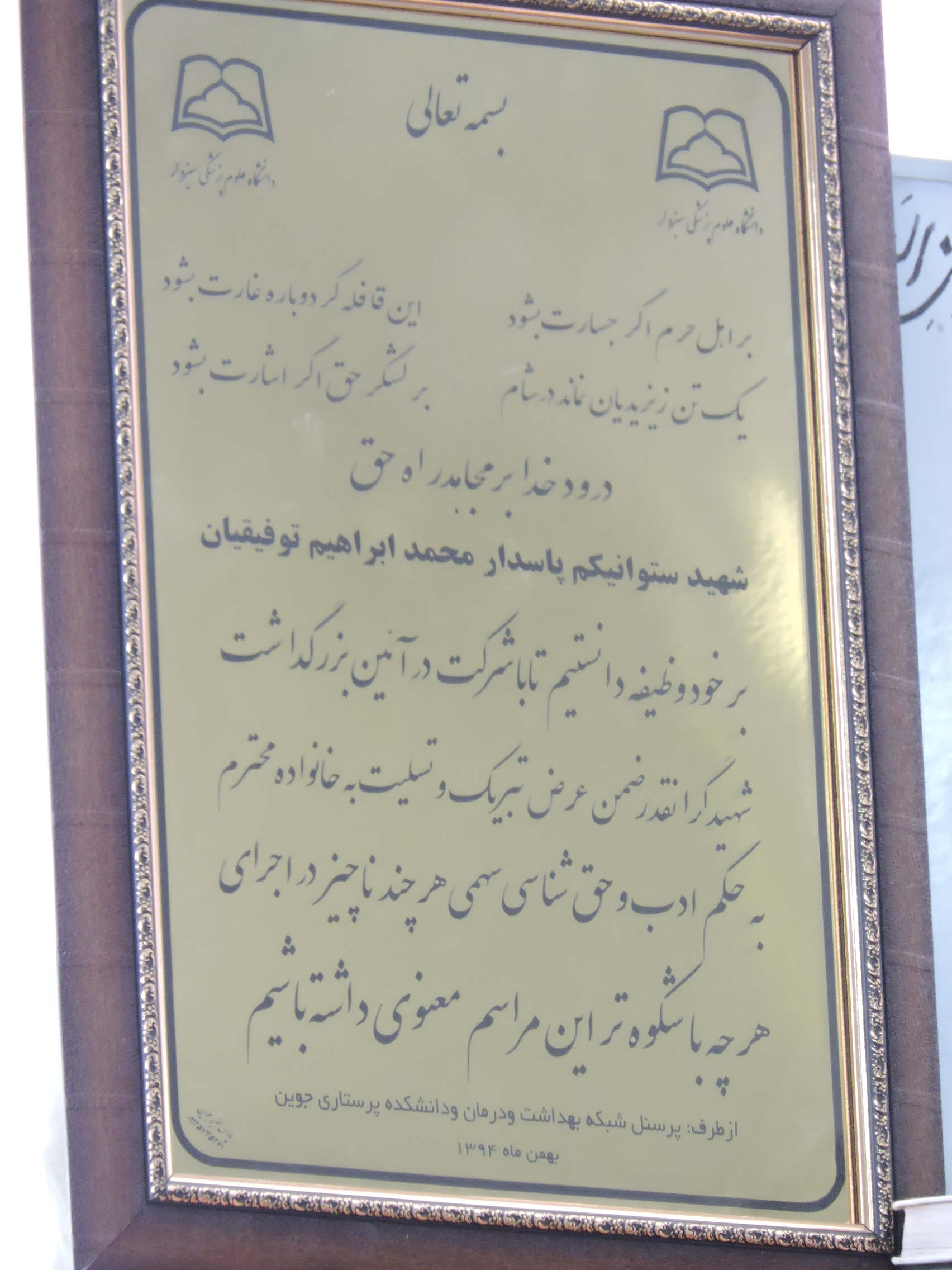 دکتر محمد رضا قزلقارشی-ریاست شبکه بهداشت ودرمان ودانشکده پرستاری جوین ضمن عرض تبریک و تسلیت به مناسبت شهادت یکی از پاسداران سرافراز این مرزوبوم با اعزام نمایندگان خود به شهرستان اسفراین که حامل لوحی با مضمون ذیل بود اعلام همدردی نمودند