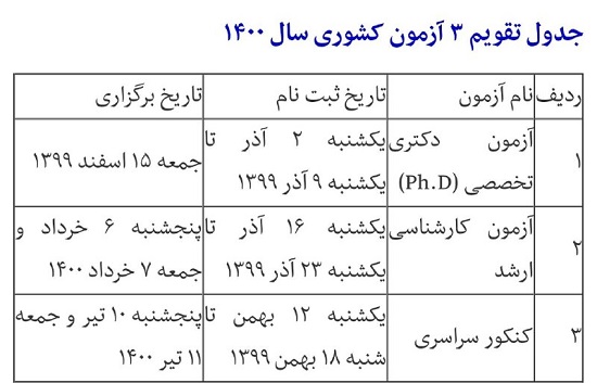 سازمان سنجش آموزش کشور تقویم آزمون های دکتری تخصصی، کارشناسی ارشد، کنکور سراسری سال ۱۴۰۰ را اعلام کرد.