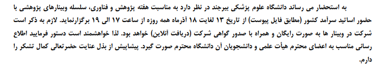 برگزاری وبینارهای پژوهشی کشوری به مناسبت هفته پژوهش با تدریس اساتید سرآمد کشوری در دانشگاه علوم پزشکی بیرجند