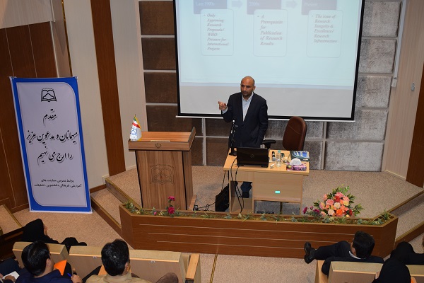دکتر احسان گوشکی پزشک ومتخصص اخلاق پزشکی ونیز دبیرکمیته ملی اخلاق در پژوهش وزارت بهداشت ،درمان وآموزش پزشکیدر سخنانی پیرامون اهمیت وضرورت اخلاق در نشر ونیز دستورالعمل اخلاق در انتشارآثار پژوهشی وهم چنین ارائه موارد شایع وآموزنده تخلفات در انتشار آثار پژوهشی مطالب مبسوطی رابرای حاضرین در این کارگاه ارزشمند پژوهشی عنوان نمود.