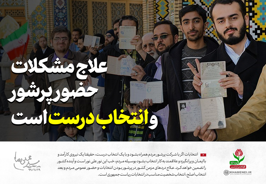 یک جمله [هم] دربارهی انتخابات عرض بکنم. انتخابات در کشور ما یک فرصت بسیار بزرگ است؛ این فرصت را نباید از دست داد. البتّه مخالفین جمهوری اسلامی نمیخواهند جمهوری اسلامی از این فرصت استفاده کند. انتخابات این خصوصیّات را دارد: این یک امکان برای ملّت است، یک ظرفیّت بزرگ برای پیشرفت کشور است؛ شور انقلابی مردم را نشان میدهد. وقتی مردم در انتخابات شرکت کنند و شور انقلابی خودشان را نشان بدهند، این موجب امنیّت کشور میشود، این موجب پس زدن دشمنان میشود، طمع دشمن را در کشور کم میکند. انتخابات هر چه پرشورتر، هر چه با اقبال عمومی مردم بیشتر همراه باشد، اثرات و منافعش برای کشور و برای خود مردم بیشتر خواهد بود. و البتّه عرض کردیم دشمنان این را نمیخواهند؛ لذا هر وقت نزدیک انتخابات میشود -در همهی دورهها؛ ما نزدیک چهل انتخابات داشتیم در این سالها- اینها شروع میکنند، گاهی میگویند آزادی نیست، گاهی میگویند دخالت فلان است، گاهی میگویند مهندسی است، گاهی میگویند چنین است، برای اینکه مردم را دلسرد کنند از حضور در انتخابات؛ این، کار دشمن است. لکن حقیقت قضیّه این است که انتخابات برای کشور یک افتخار است، یک فرصت است، یک امکان است، یک ذخیره است که اگر شرکت پرشور مردم باشد، این یقیناً به آیندهی کشور کمک خواهد کرد. البتّه اگر این شرکت پرشور مردم همراه بشود با یک انتخاب درست که حقیقتاً یک نیروی کارآمد و باایمان و پرانگیزه و علاقهمند به کار انتخاب بشود به وسیلهی مردم، خب این نورٌعلیٰنور است و آیندهی کشور را تضمین خواهد کرد. حالا من در باب انتخابات، در ماههای آینده که فرصت هست، اگر زنده بودم، حرفهای زیاد دیگری دارم که عرض خواهم کرد؛ امروز همین یک جمله را خواستم عرض بکنم. میخواهم بگویم علاج دردهای مزمن کشور در پرشور بودن انتخابات و حضور عمومی مردم و بعد، انتخاب اصلح، انتخاب شخصیّت مناسب در انتخابات ریاست جمهوری است.