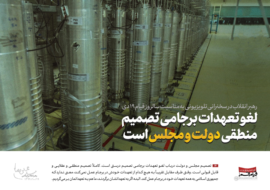 مطلب دوّم این [است] که تصمیم مجلس و دولت در باب لغو تعهّدات برجامی، تصمیم درستی است؛ کاملاً تصمیم منطقی و عقلایی و قابل قبولی است. وقتی طرف مقابل، تقریباً به هیچ کدام از تعهّدات خودش در برجام عمل نمیکند، معنی ندارد که جمهوری اسلامی به همهی تعهّدات خودش در برجام عمل کند؛ لذا از مدّتی پیش تدریجاً بعضی از تعهّدات را لغو کردند، اخیراً هم تعهّدات دیگری را کنار گذاشتند. و البتّه اگر چنانچه آنها به تعهّداتشان برگردند، ما هم به تعهّداتمان برمیگردیم؛ بنده از اوّل هم همین را گفتم. از اوّلی که برجام مطرح شد، بنده گفتم که تعهّد در مقابل تعهّد؛ متناظر، کار آنها در مقابل کار ما؛ هر کاری که ما بنا است بکنیم، باید طرف مقابل هم متناظر با آن کار را بکند؛ خب این اوّل کار انجام نگرفت، حالا بایستی انجام بگیرد.