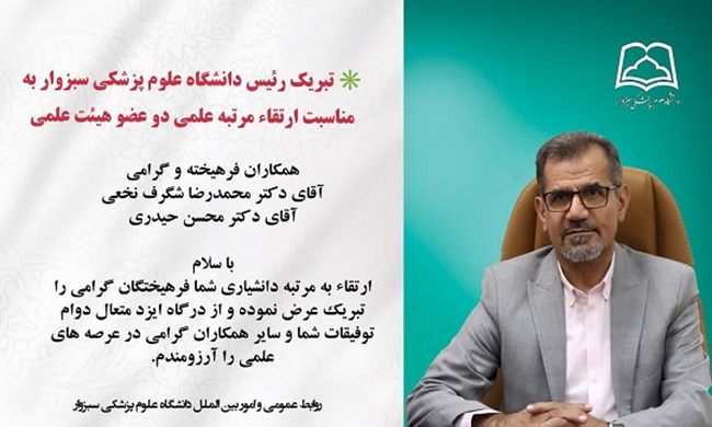 دکتر رضا چمن، رئیس دانشگاه علوم پزشکی و خدمات بهداشتی درمانی سبزوار با صدور پیامی، ارتقاء مرتبه علمی دو نفر از اعضای هیئت علمی دانشگاه را تبریک گفت.