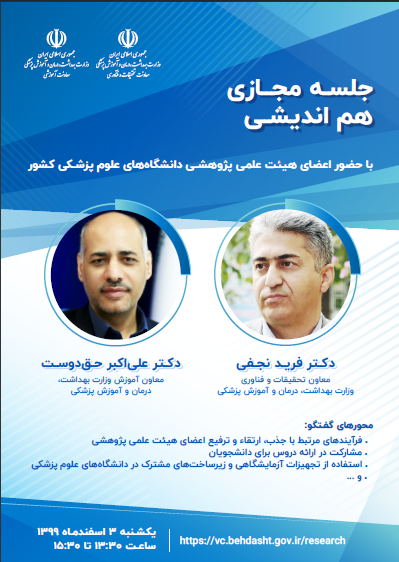 قابل توجه اعضا محترم هیات علمی پژوهشی دانشگاه جلسه هم اندیشی با حضور اعضای هیات علمی پژوهشی دانشگاه های علوم پزشکی کشور با حضور دکتر فرید نجفی و دکتر علی اکبر حقدوست معاونین تحقیقات و فناوری و آموزشی وزارت بهداشت در روز یکشنبه مورخ: تاریخ 99/12/03 از ساعت 13:30 برگزار می گردد.