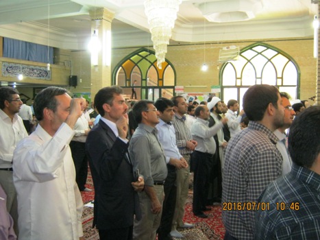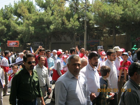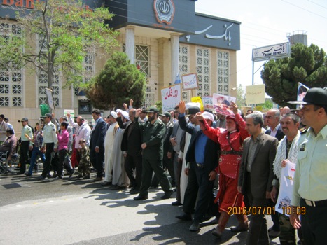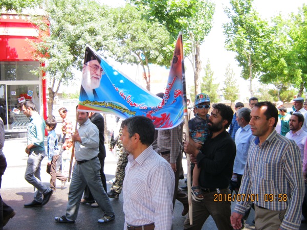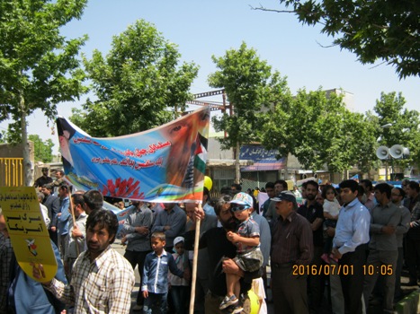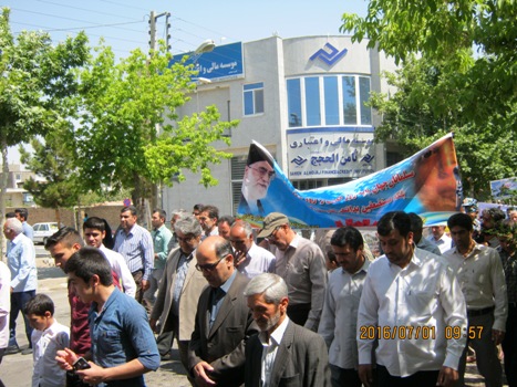 درآخرین جمعه ماه مبارک رمضان مورخه 1395/4/11 ، به مناسبت روز جهانی قدس و درحمایت ازمردم مظلوم فلسطین ، کارکنان شبکه بهداشت و درمان ، پرسنل بیمارستان ولی عصر(عج) و بسیجیان کانون بسیج جامعه پزشکی شهرستان جغتای به همراه دیگر اقشارمردم با شرکت در راهپیمایی روزقدس ومراسم باشکوه نمازجمعه ، ضمن تجدید میثاق باولایت و آرمانهای انقلاب اسلامی ، برائت خود را از اسرائیل غاصب ،آمریکا وکشورهای هم پیمان آنها اعلام  نمودند.