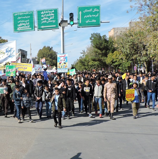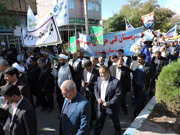 همزمان با سراسر كشور كاركنان شبكه بهداشت و درمان جوین به همراه دانشآموزان، دانشجویان و مردم شریف جوین در راهپیمایی یوم ا... 13 آبان حماسه ای دیگر از حضور بصیرت مدار ملت در دفاع از آرمان های بلند امام خمینی (ره) را رقم زدند وبه مستكبران اعلام نمودند كه این ملت تا آخرین لحظه در برابر شیطان بزرگ خواهد ایستاد وبا فریادشان آمریكای جنایتكار و اسراییل را محكوم کردند.