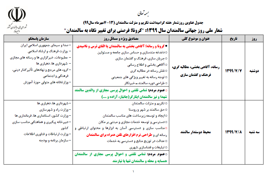 در آستانه روز جهانی سالمند مصادف با 9 مهرماه سال جاری ( اول اکتبر 2020 ) و هفته ملی سالمند از 7 تا 13 مهرماه  و به منظور بزرگداشت این روز، برگزاری وبینار با موضوع سالمندی در روز 13 مهرماه ساعت 9 تا 12 با محوریت انجمن سالمند شناسی و طب سالمندی ایران و همکاری دانشگاه علوم پزشکی مجازی انجام میگیرد.