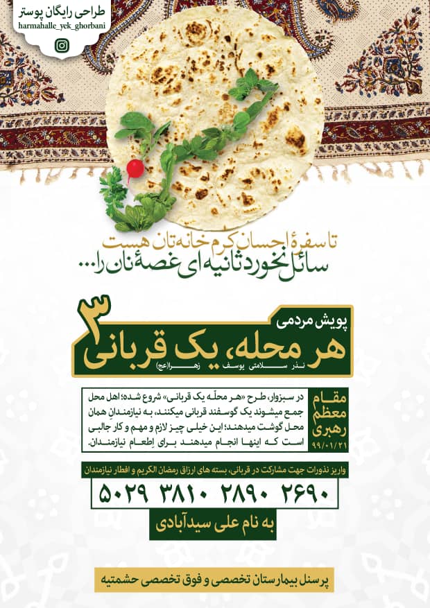 پویش هر محله یک قربانی حرکت نابی است که از سمت همشهری های خودمان شروع شده است ، حرکت متمرکزی برای اینکه بتوانیم با همت هم گوشه ای از درد همشهریان نیازمندمان را در این ماه مهربانی التیام بخشیم ...
