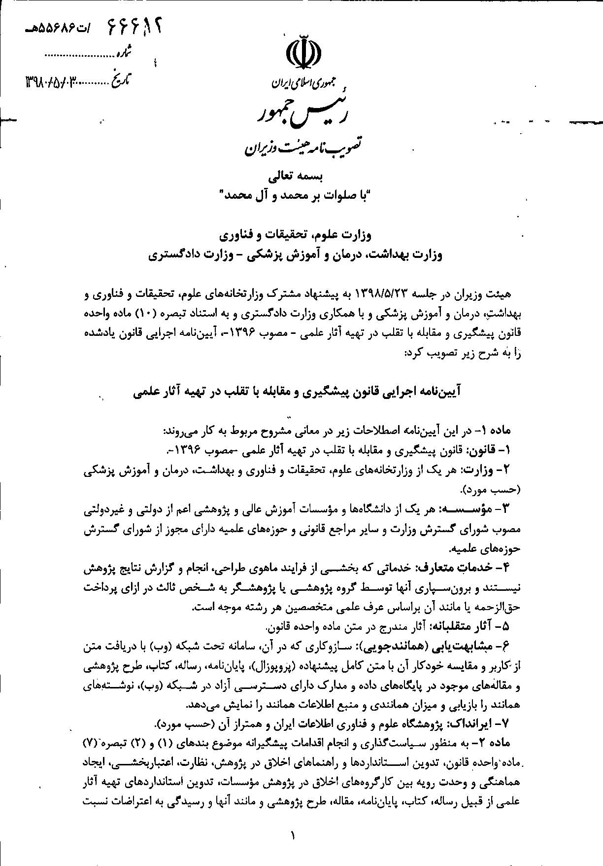 آئین نامه اجرایی قانون پیشگیری و مقابله با تقلب در تهیه آثار علمی و بخشنامه مرتبط با انتشارات تکراری و همپوشان جهت اجرا به دانشگاههای علوم پزشکی کشور ابلاغ گردید