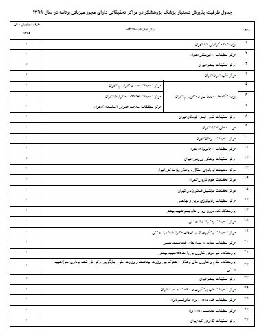 به استحضار می رساند با توجه به آغاز تمدید زمان ثبت نام هفتمین فراخوان برنامه پزشک پژوهشگر به شرح ذیل مراکز تحقیقاتی دارای مجوز میزبانی در سال 1399 و سامانه rcd.research.ac.ir اعلام میداریم.