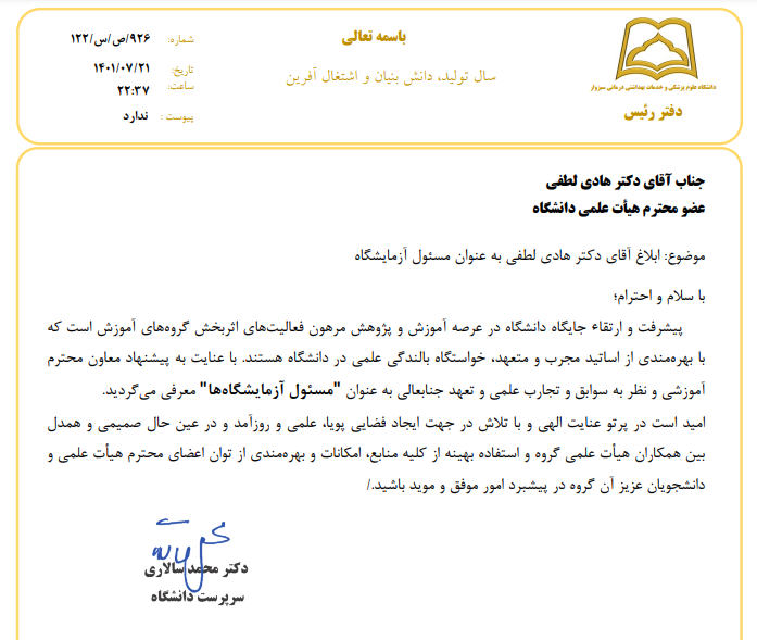 دکتر محمد سالاری سرپرست دانشگاه در حکمی دکتر هادی لطفی را به عنوان مسئول  آزمایشگاه ها دانشگاه منصوب کرد.