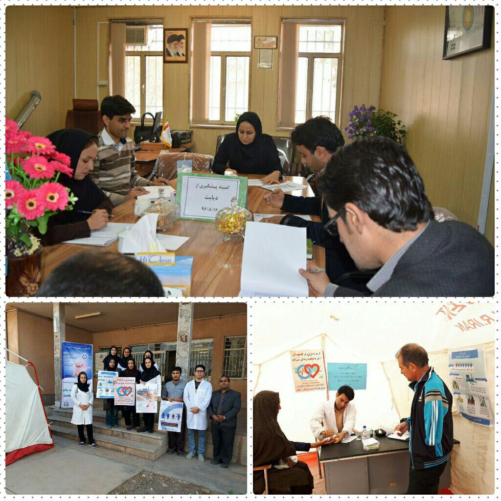گفتنی است پس از برنامه ریزی و پیگیری در خصوص اطلاع رسانی به مناسبت هفته دیابت در شهرستان انجام گردید که می توان از اهم برنامه های انجام گرفته در این هفته در سطوح مختلف شبکه بهداشت ودرمان خوشاب به *غربالگری (تست قندخون) در سطوح مختلف مراکز و خانه های بهداشت /برگزاری مسابقه نقاشی با موضوع دیابت در سطوح مختلف مدارس شهرستان و اهداء جایز به برندگان /برگزاری جلسات متعدد آموزشی  با موضوع دیابت ، در سطوح مختلف تحت پوشش شبکه اعم از بهورزان،داوطلبین سلامت /تو زیع بیش از 300 عدد پمفلت با موضوعات ((تغذیه و دیابت))،  (( دیابت و زنان))، ((ورزش و دیابت )) در بین مراکز تحت پوشش و اهالی روستاهای تحت پوشش./هماهنگی و دعوت از انجمن حمایت از بیماران دیابتی مرکز نوده انقلاب و اهداء 50 دستگاه قند خون به بیماران دیابتی تحت پوشش مرکز و  برگزاری  جشنواره غذای سالم با همکاری واحد بهداشت خانواده و روابط عمومی شبکه ،بین پرسنل شبکه خوشاب ، داوطلبین سلامت شهرستان ، مشارکت پارلمان زنان شهرستان و روسای ادارات ونهادهای شهرستان از جمله معاون  فرمانداری و شهردار محترم خوشاب واهدائ جوایز نفیس به 5 نفر از برندگان جشنواره.  نام برد./200