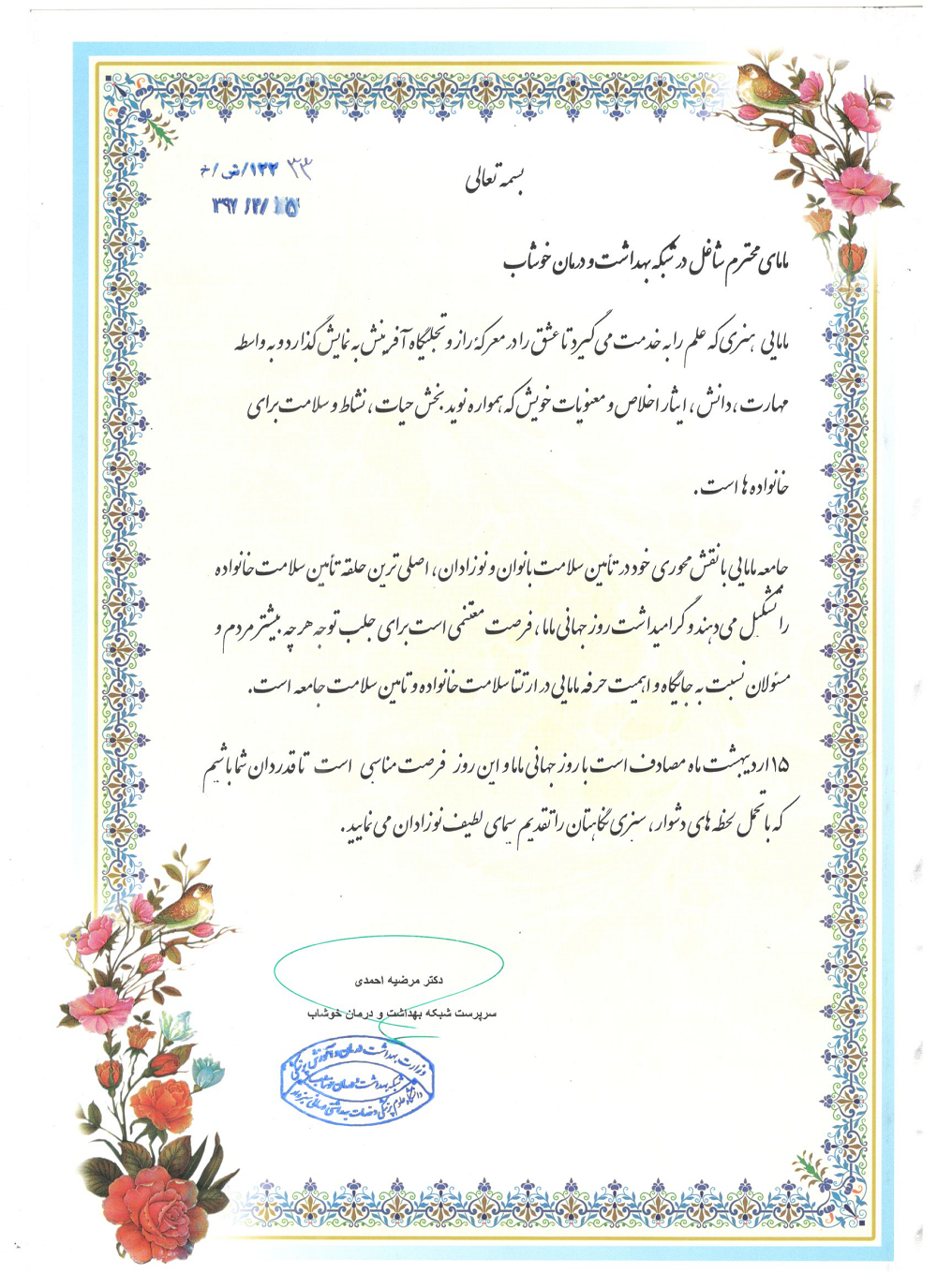 تبریک سرپرست شبکه بهداشت ودرمان خوشاب به مناسبت روز جهانی ماما