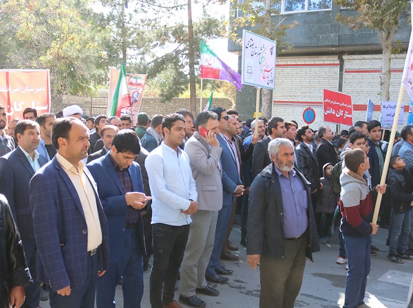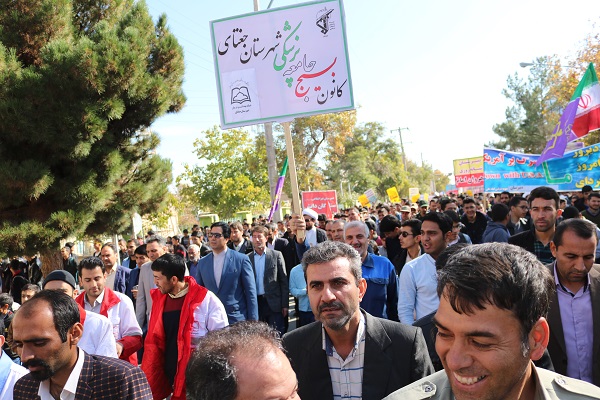 روابط عمومی شبکه بهداشت و درمان جغتای/ مهندس حسین زرقانی به همراه پرسنل شبکه بهداشت ودرمان، مدیریت و پرسنل بیمارستان ولی عصر(عج) واعضای بسیج جامعه پزشکی شهرستان جغتای  به منظور تجدید میثاق با آرمان‌های بلند امام خمینی (ره)، رهبر معظم انقلاب و در راستای حفظ و صیانت از آزادگی و استقلال ایران اسلامی، در راهپیمایی روز سیزده آبان روزمبارزه با استکبارحضور یافته، و با سر دادن شعارهای مرگ به آمریکا و اسرائیل و ضد استکباری انزجار خود را از استکباران جهانی در این مراسم اعلام نمودند .