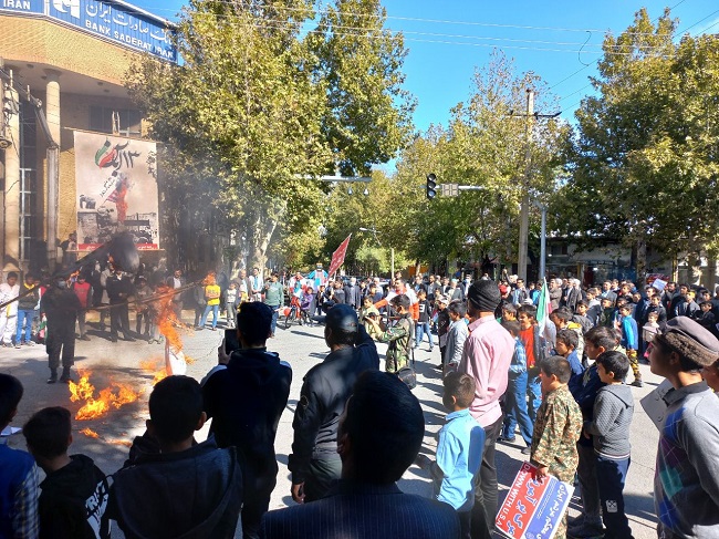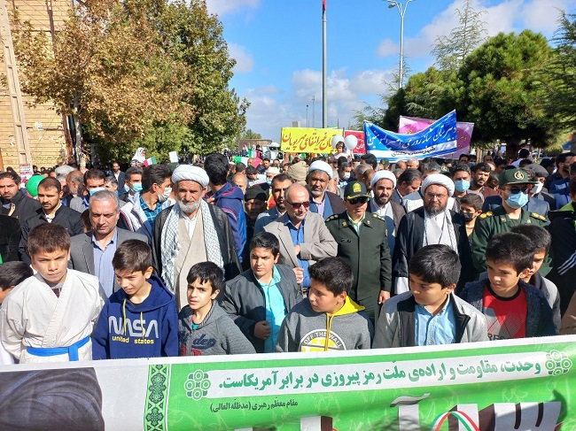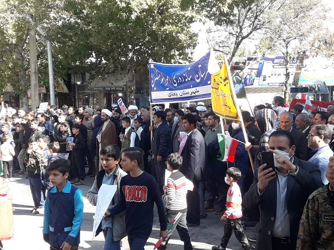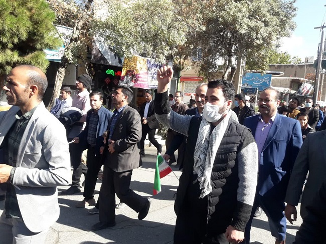 به گزارش روابط عمومی و فرهنکی شبکه بهداشت و درمان جغتای/ غلامرضا شرفی سرپرست به همراه پرسنل شبکه بهداشت و درمان، بیمارستان ولی عصر(عج) و اعضای کانون بسیج جامعه پزشکی شهرستان جغتای همگام با ملت با بصیرت و همیشه در صحنه ایران، با حضور پرشور در راهپیمایی عظیم  یوم الله ۱۳ آبان، با اعلام حمایت قاطع از دستاوردهای انقلاب اسلامی و تجدید میثاق با آرمان های حضرت امام راحل(ره)، مقام معظم رهبری حضرت امام خامنه ای(مدظله العالی) و شهیدان، برائت و انزجار خود را از آمریکای تروریست، اسرائیل غاصب و کشورهای هم پیمان آنها اعلام کردند.