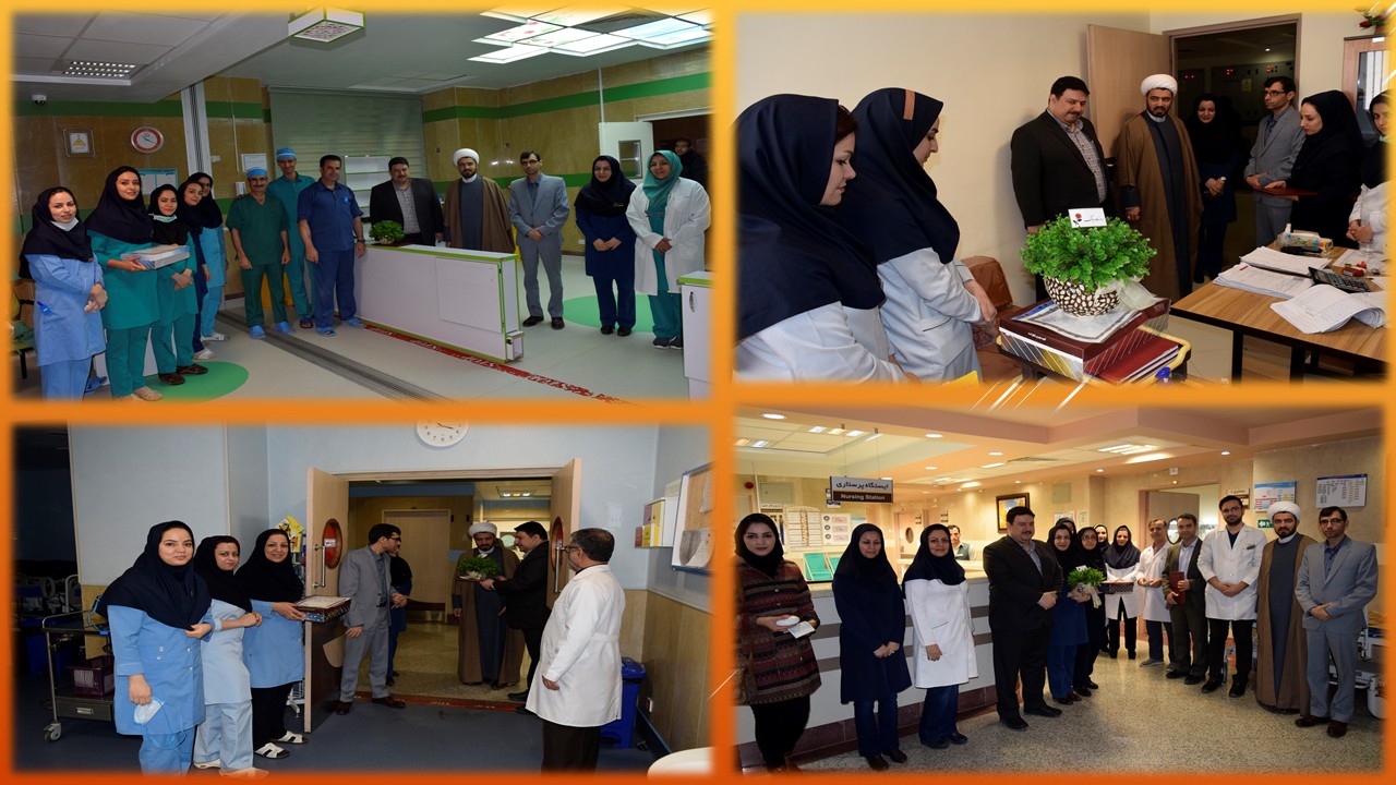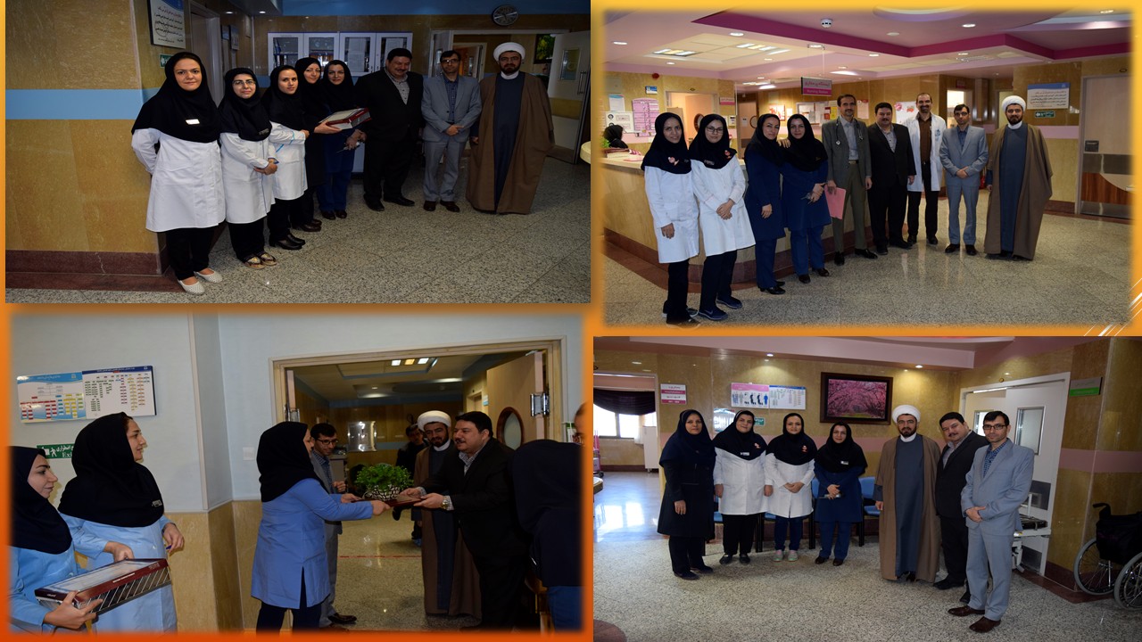 حضور ریاست بیمارستان جناب اقای دکتر راستی و حجت الاسلام مهدوی نسب مسئول دفتر نهاد رهبری دانشگاه در بخش های بالینی بیمارستان جهت تقدیر و تشکر و تبریک روز پرستار به همکاران پرستار گرامی