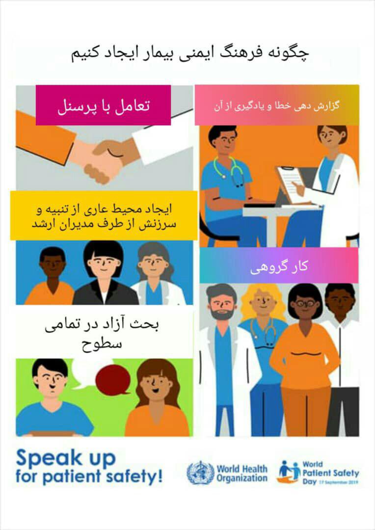 "World Patient Safety Day" روز جهانی بسیج ایمنی بیمار اعلام نموده است .این سازمان به منظور کاهش صدمات و آسیب وارده به بیماران از ناحیه خدمات سلامت غیر ایمن بر سه محور به شرح ذیل تاکید نموده است: