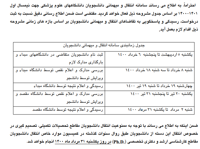زمان بندی سامانه نقل و انتقال در نیمه اول سال 1401-1400