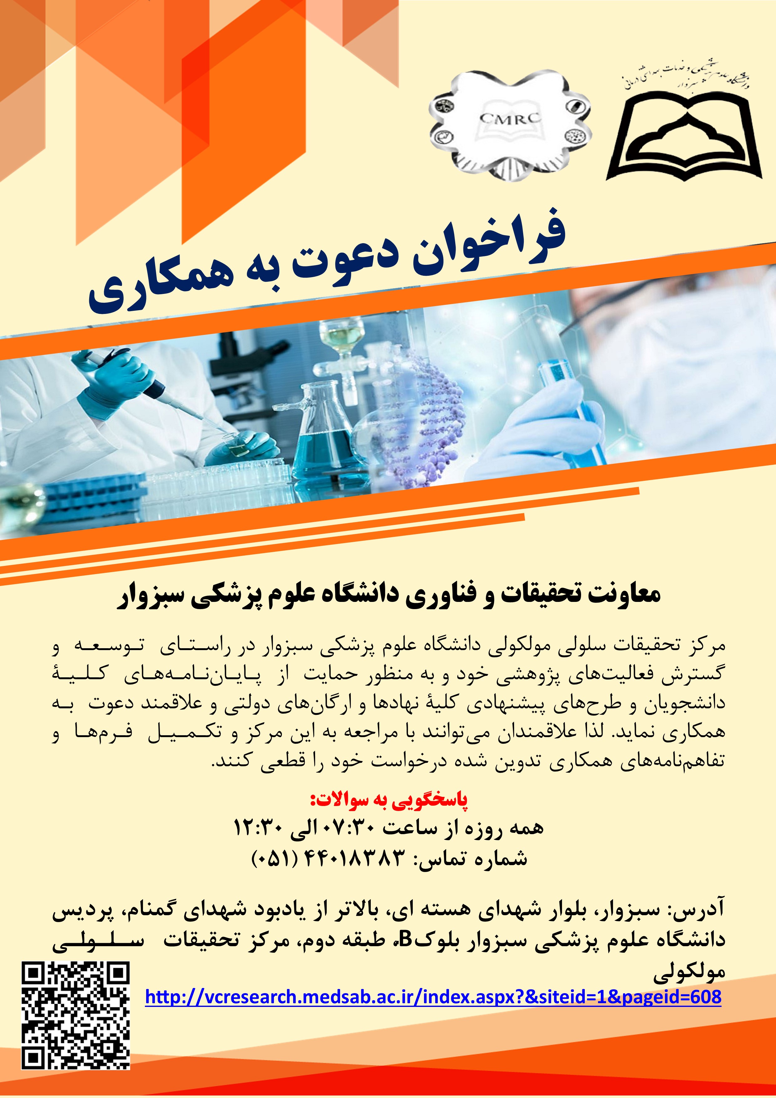 با عنایت به لزوم همکاری مراکزتحقیقاتی و دانشگاهی و سایر ارگانهای و نهادهای دولتی و خصوصی در راستای رسیدن به هدف ارتقائ پژوهش های علمی-بنیادی کشور و شکوفایی هر چه بیشتر افکار بالقوه به استحضار میرساند معاونت تحقیقات و فن آوری دانشگاه علوم پزشکی سبزوار از طریق مرکز تحقیقات سلولی مولکولی خود اقدام به فراخوان همکاری جهت تدوین پروژه های علمی با مشارکت اعضا هیات علمی مجرب خود و همچنین ارائه خدمات آزمایشگاهی –دستگاهی نموده است.