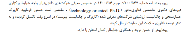 معرفی شرکت های دانش بنیان واجد شرایط برگزاری دوره های دکتری تخصصی فناوری محور