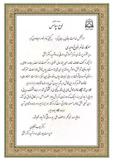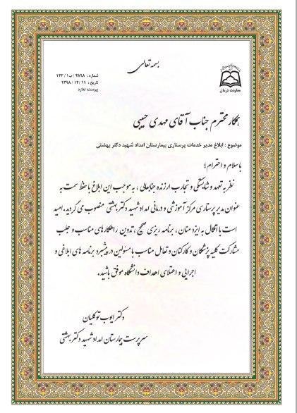 معرفی مدیرجدید پرستاری مرکز آموزشی ودرمانی امداد شهید بهشتی سبزوار