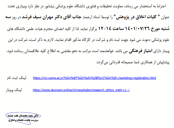 روابط عمومی معاونت تحقیقات و فناوری دانشگاه؛ وبینار کلیات اخلاق در پژوهش گروه خبری : معاونت تحقیقات و فناوری,مرکز تحقیقات سلولی مولکولی کد خبر : 15343 لینک کوتاه : https://medsab.ac.ir/ZaLa کلمات کلیدی
