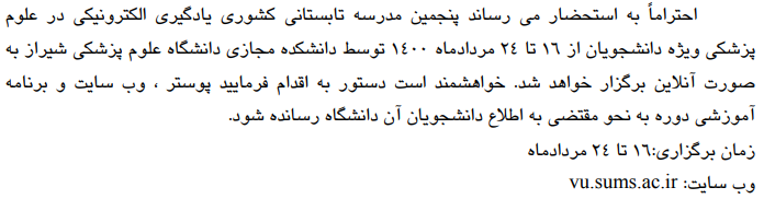 روابط عمومی معاونت آموزشی دانشگاه؛ پنجمین مدرسه تابستانی کشوری یادگیری الکترونیکی در علوم پزشکی ویژه دانشجویان گروه خبری : دانشکده پزشکی,معاونت آموزشی,سایراخبار دانشکده پزشکی کد خبر : 13274 لینک کوتاه : https://medsab.ac.ir/ZSna کلمات کلیدی