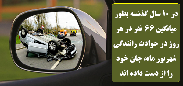 به گزارش روابط عمومی معاونت بهداشتی / سید محسن مهری کارشناس سوانح و حوادث معاونت بهداشتی اظهار داشت: به استناد آمار رسمی پزشکی قانونی کشور، در شهریورماه هر سال شاهد بیشترین آمار قربانیان حوادث ترافیکی هستیم. در 10 سال گذشته (1387 تا 1396) بالغ بر 20464 نفر یعنی میانگین 66 نفر از هموطنان عزیز (معادل جان باختگان حادثه سقوط هواپیمای تهران یاسوج) در هر روز در حوادث رانندگی شهریور ماه، جان خود را از دست داده اند. ثبت بالاترین آمار فوت روزانه سال 1396 با 81 نفر فوت در 23 شهریور، یک هشدار جدی برای امسال و سال های آتی بوده است. آمار 21 برابری تعداد مصدومین در گزارشات رسمی پزشکی قانونی (336 هزار مصدوم در سال 96)، یک تراژدی و هشدار جدی است که بار مالی سنگینی را هم بر دوش دولت می گذارد.