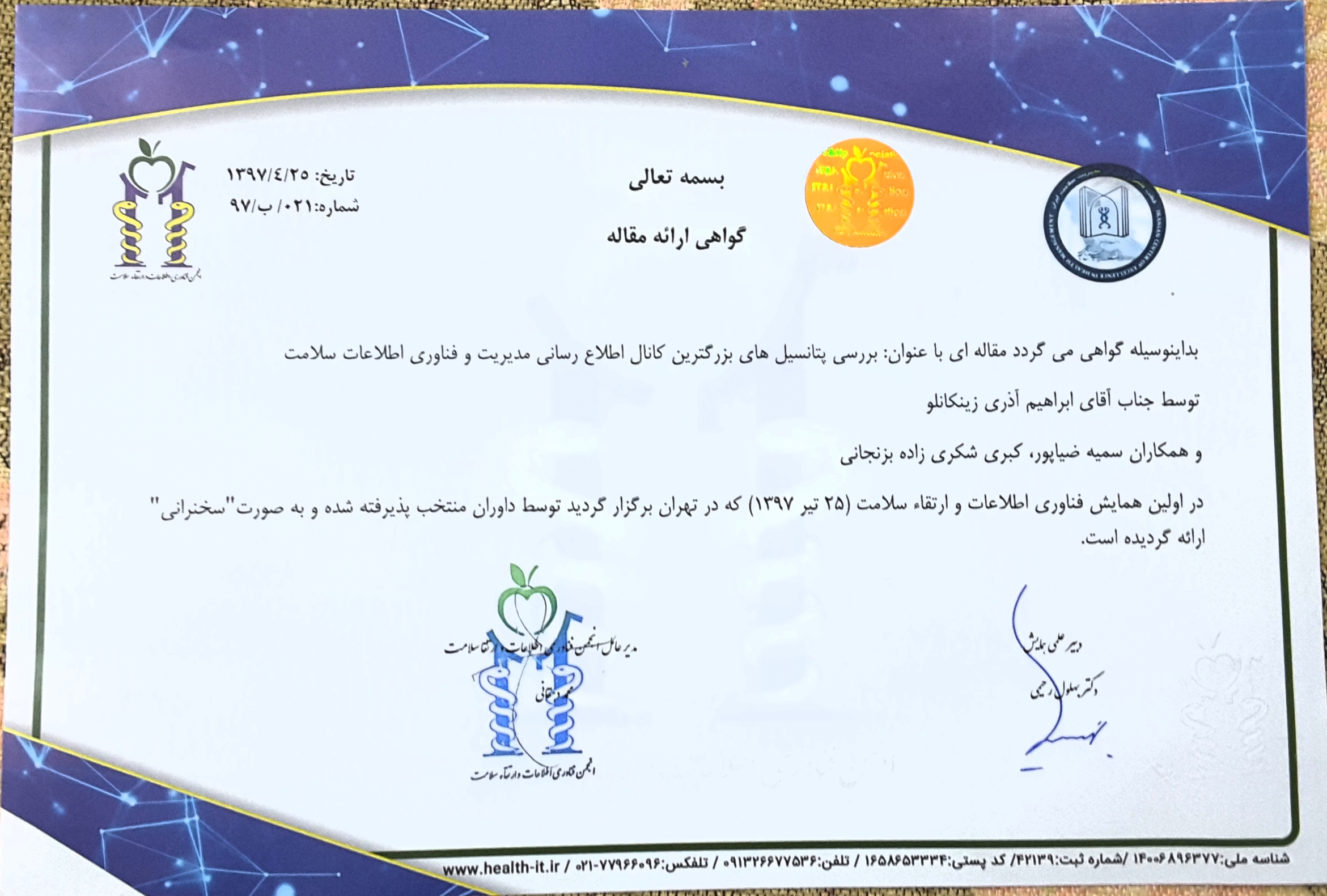 در همایشی که 25 تیرماه در شهر تهران برگزار شد مقاله آقای ابراهیم آذری زینکانلو کارمند مدارک پزشکی بیمارستان قمر بنی هاشم (ع) جوین تحت عنوان " بررسی پتانسیلهای بزرگترین کانال اطلاع رسانی مدیریت و فناوری اطلاعات سلامت" بصورت سخنرانی پذیرش و ارائه شد