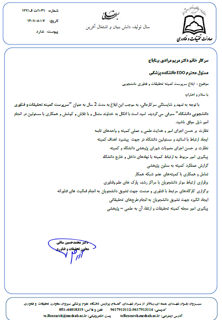 طی حکمی از سمت معاون تحقیقات و فناوری دانشگاه، سرپرست کمیته تحقیقات و فناوری دانشجویی منصوب شد
