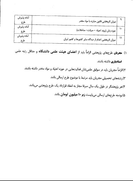 11 عنوان اولویت های پژوهشی (طرح های ملی) تعیین شده توسط ستاد مبارزه با مواد مخدر