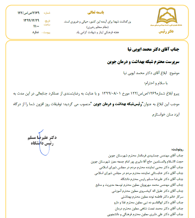 ابلاغ ریاست شبکه بهداشت و درمان جوین دکتر محمد ایوبی نیا